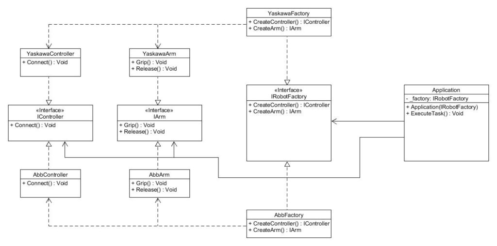 YaskawaFactory, AbbFactory: Concrete factories. They implement methods from the abstract factory interface. Each family of product must have own factory. In concrete factories, methods returns products of the concrete type.